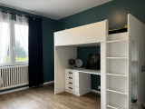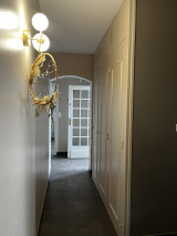 Le couloir a beaucoup de cachet avec ses nombreux placards en bois peint. Trois belles chambres et en plus, une suite parentale avec sa propre salle de douches.